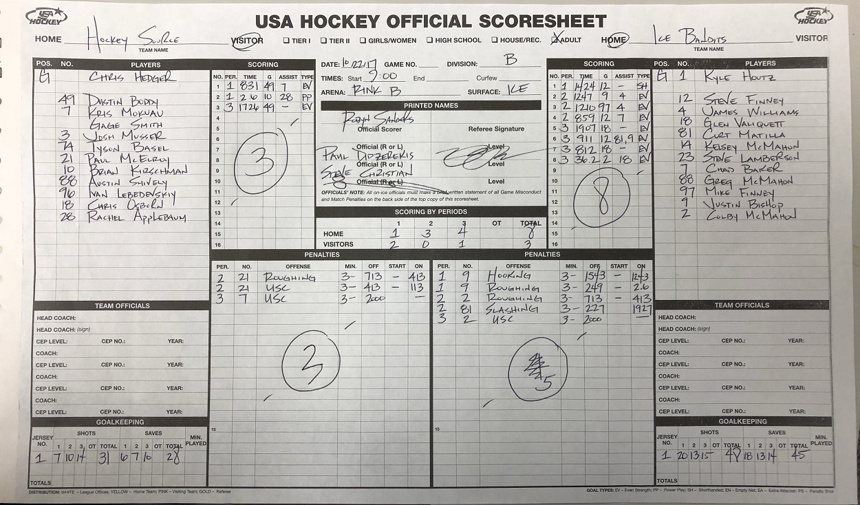 Champs: Penguins8 0 0 0 16 8 46 19 Ice Bandits 6 2 0 0 12 8 46 29 zHop Heads 6 2 0 0 12 8 50 31 Hockey Source HC 5 3 0 0 10 8 38 43 Money Shot 3 4 1 0 7 8 39 37 Royals 3 5 0 0 6 8 37 47 Pawned Stars 3 5 0 0 6 8 44 54 Spartans 2 6 0 0 4 8 32 47 Rebels 2 6 0 0 4 8 37 51 Iron Horse Brewery 2 6 0 0 4 8 44 55 Date Home Team Away Team Location Scoring/Clock Results 2017-09-24 09:00 PM