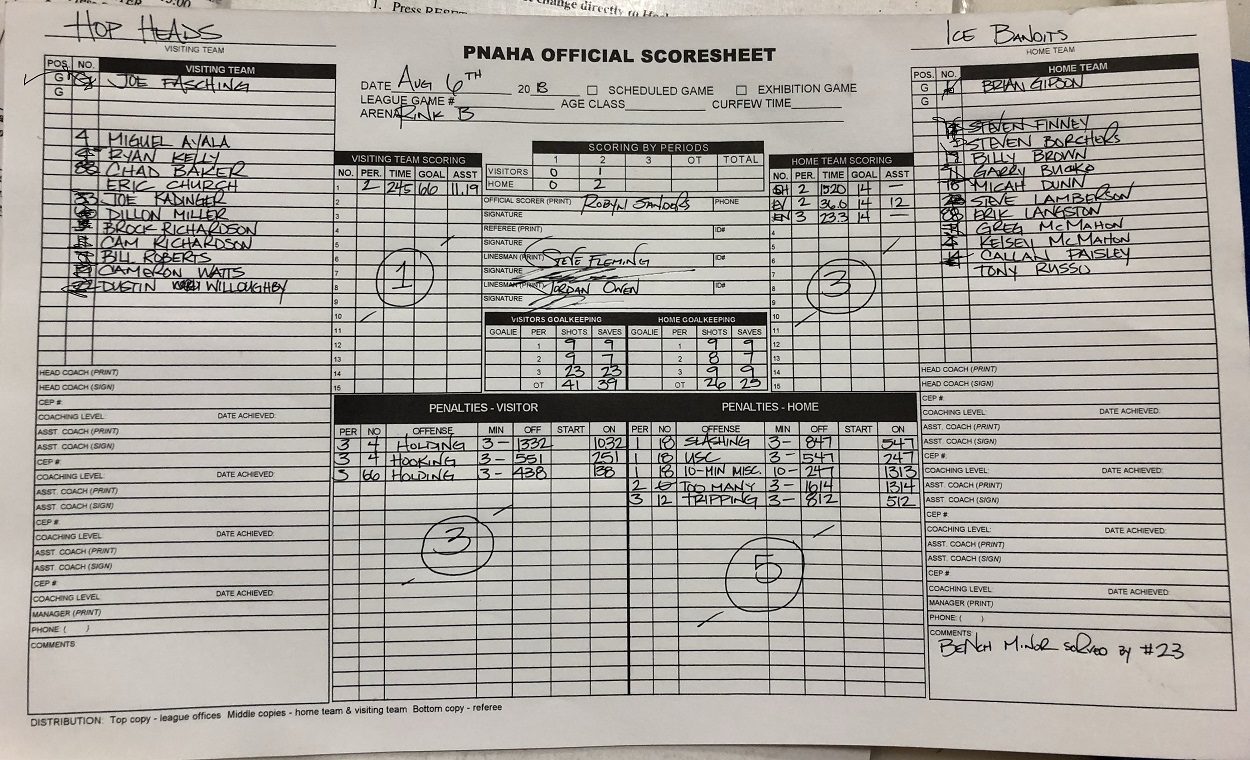 Champs: Ice Bandits2 0 0 0 4 2 11 6 Iron Horse Brewery 1 1 0 0 2 2 11 13 Pawned Stars 0 0 1 0 1 1 8 9 zHop Heads 0 1 0 0 0 1 4 6 Date Home Team Away Team Location Scoring/Clock Results Semifinal Game 1 2018-08-06 09:45 PM Ice Bandits zHop Heads Toyota Arena Robyn Sanders 3 - 1