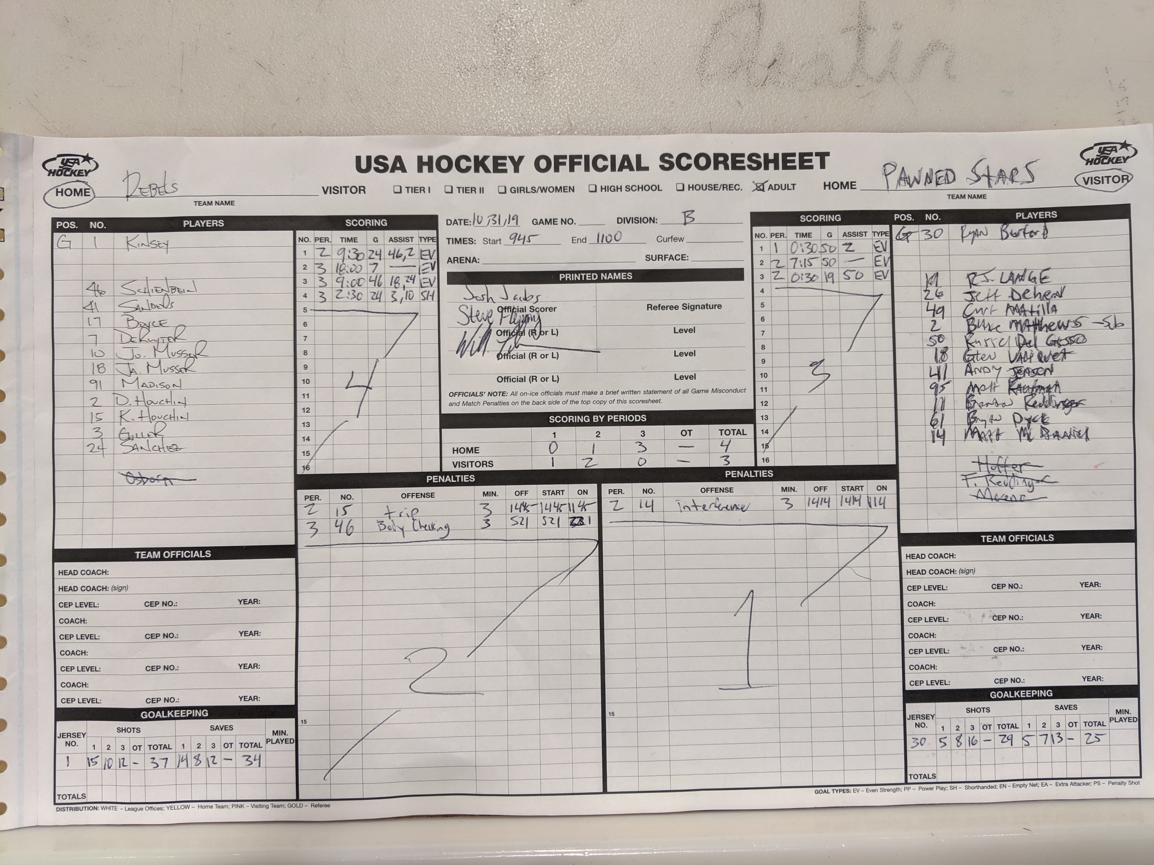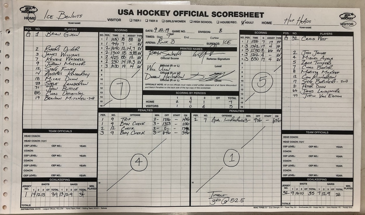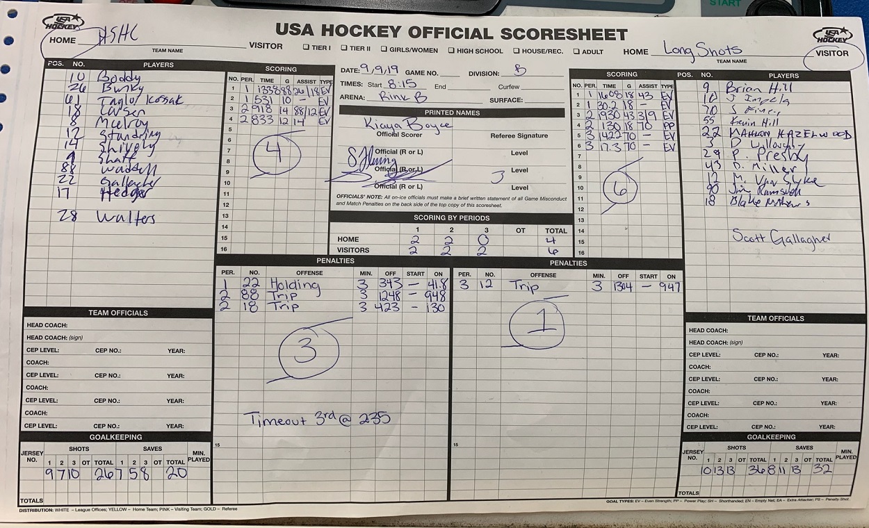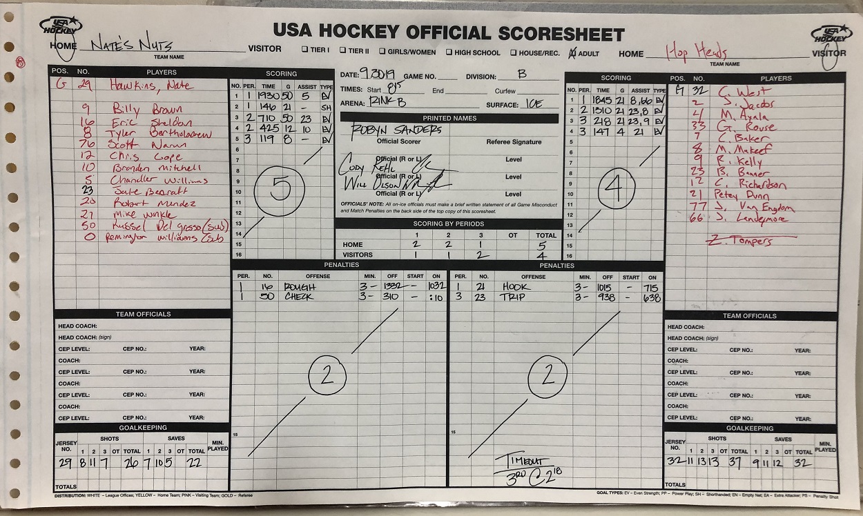 Champs: Nate's Nuts9 3 0 0 18 12 61 45 Hop Heads 9 3 0 0 18 12 76 58 Ice Bandits 8 3 1 0 17 12 71 48 Rebels 7 5 0 0 14 12 52 60 Long Shots 7 5 0 0 14 12 70 61 Iron Horse Brewery 4 7 1 0 9 12 68 88 TimeLords 4 8 0 0 8 12 64 62 Hockey Source HC 3 9 0 0 6 12 48 63 Pawned Stars 3 9 0 0 6 12 55 80 Date Home Team Away Team Location Scoring/Clock Results 2019-09-08 09:00 PM
