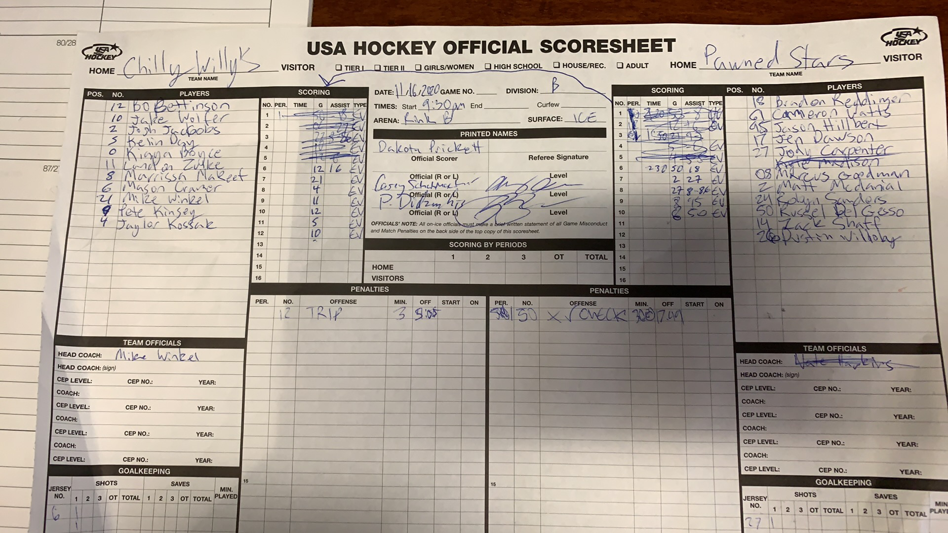 Champs: Chilly Willys6 0 0 0 12 6 50 20 Ice Bandits 3 1 1 0 7 5 35 26 Nate's Nuts 3 2 0 0 6 5 32 31 Hop Heads 2 3 1 0 5 6 28 39 Pawned Stars 2 3 0 0 4 5 31 34 Rebels 2 4 0 0 4 6 31 49 Hockey Source HC 1 3 1 0 3 5 22 30 Date Home Team Away Team Location Scoring/Clock Results 2020-11-09 07:30 PM Pawned Stars Hockey Source HC Toyota Arena Kiaya Swartz 8 - 7 OT