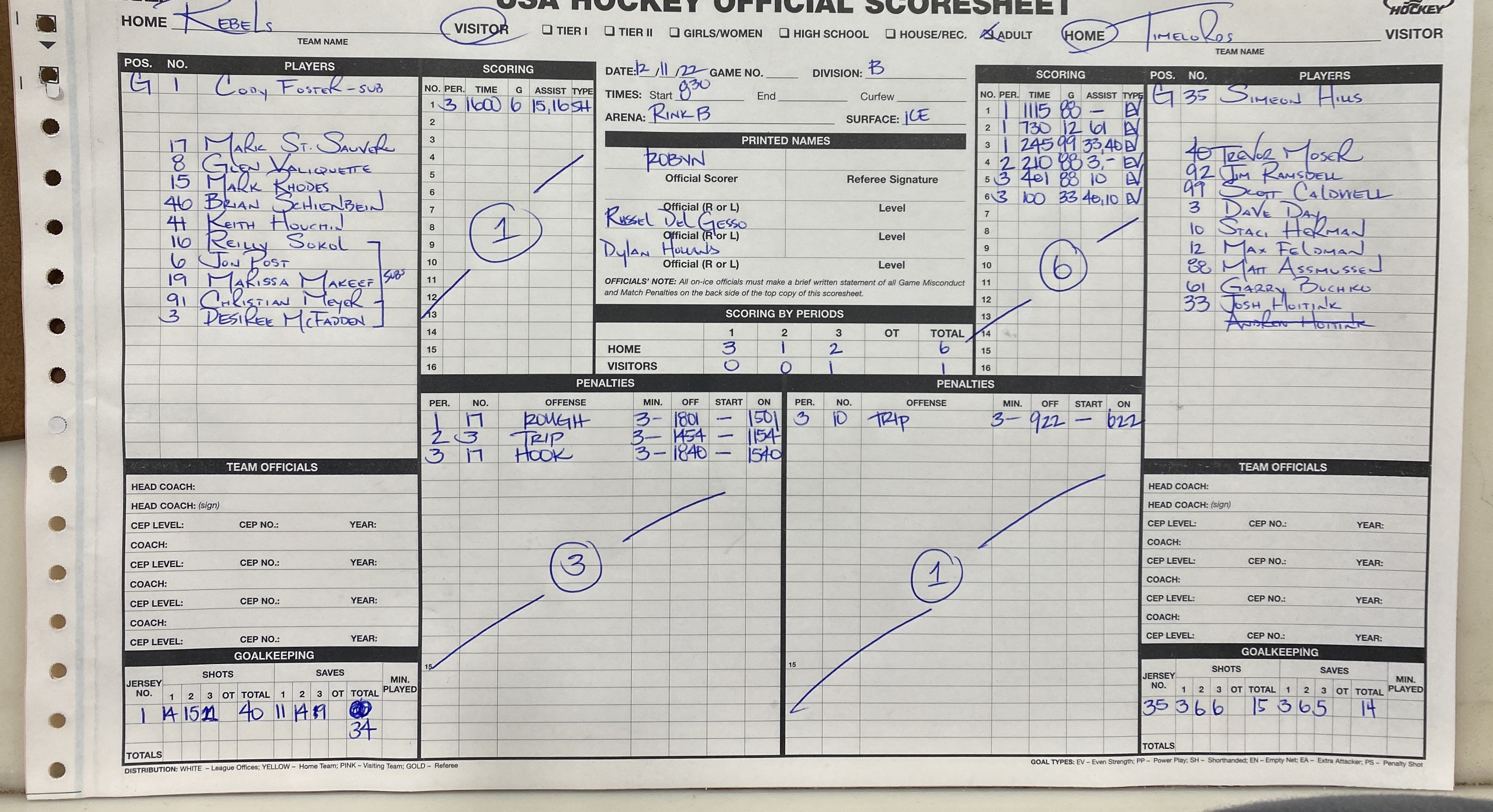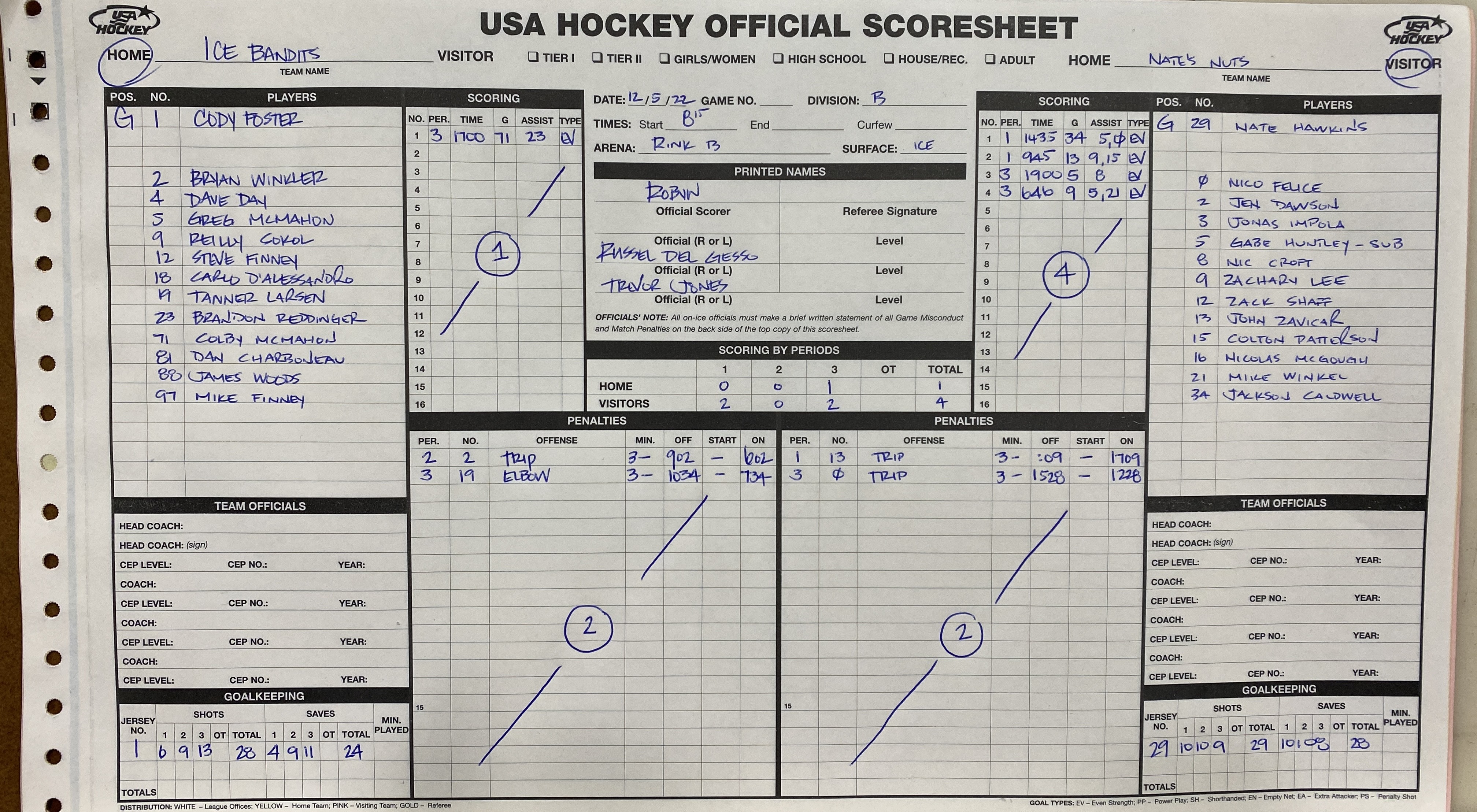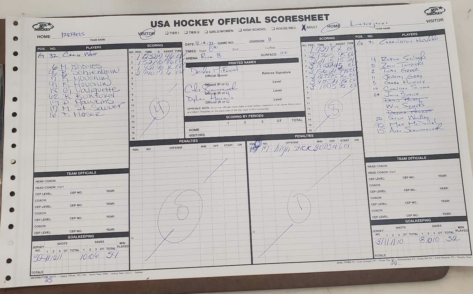 Champs: Nate's Nuts3 0 0 0 6 3 23 14 Pawned Stars 2 1 0 0 4 3 24 14 Ice Bandits 1 1 0 0 2 2 6 6 TNA 1 1 0 0 2 2 11 8 Iron Horse Brewery 1 1 0 0 2 2 15 22 TimeLords 0 1 0 0 0 1 9 10 Hop Heads 0 1 0 0 0 1 18 11 Lumberjacks 0 1 0 0 0 1 11 16 Date Home Team Away Team Location Scoring/Clock Results Consolation 2022-11-27 08:30 PM