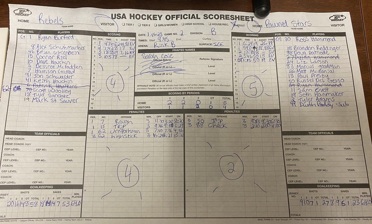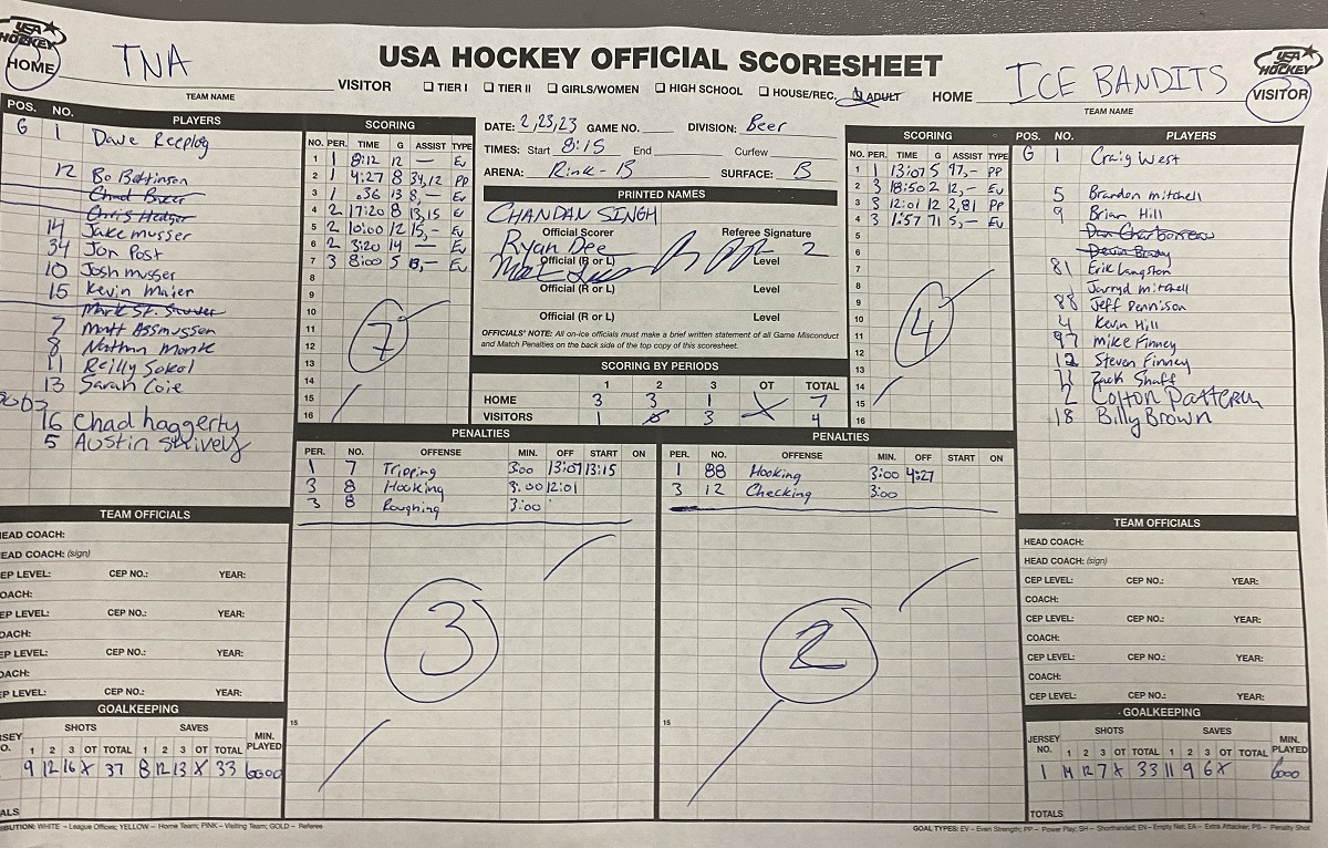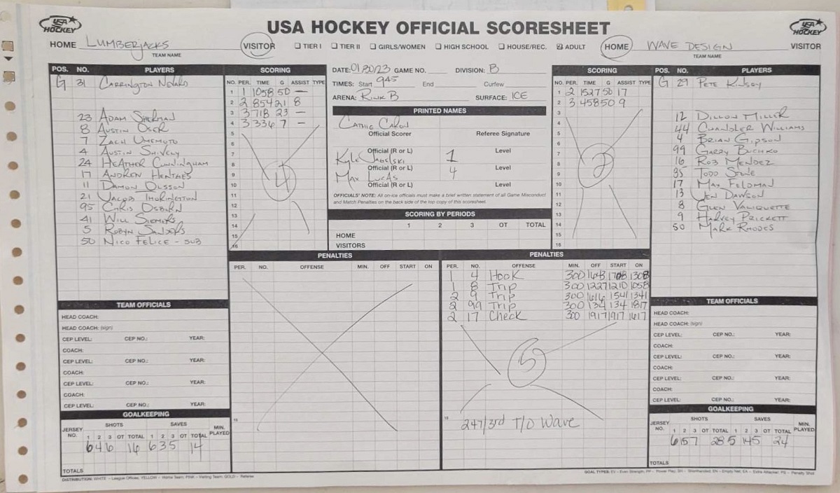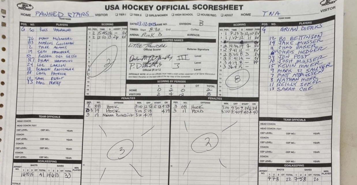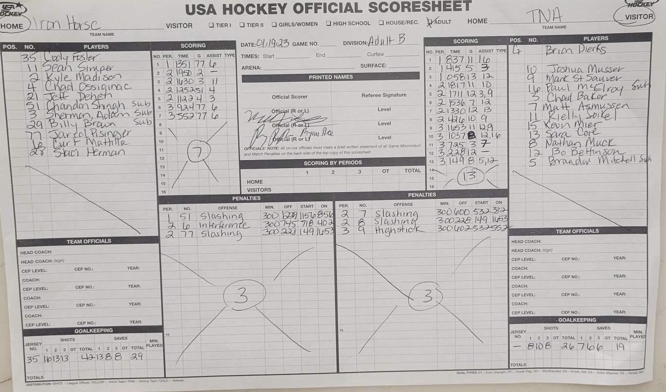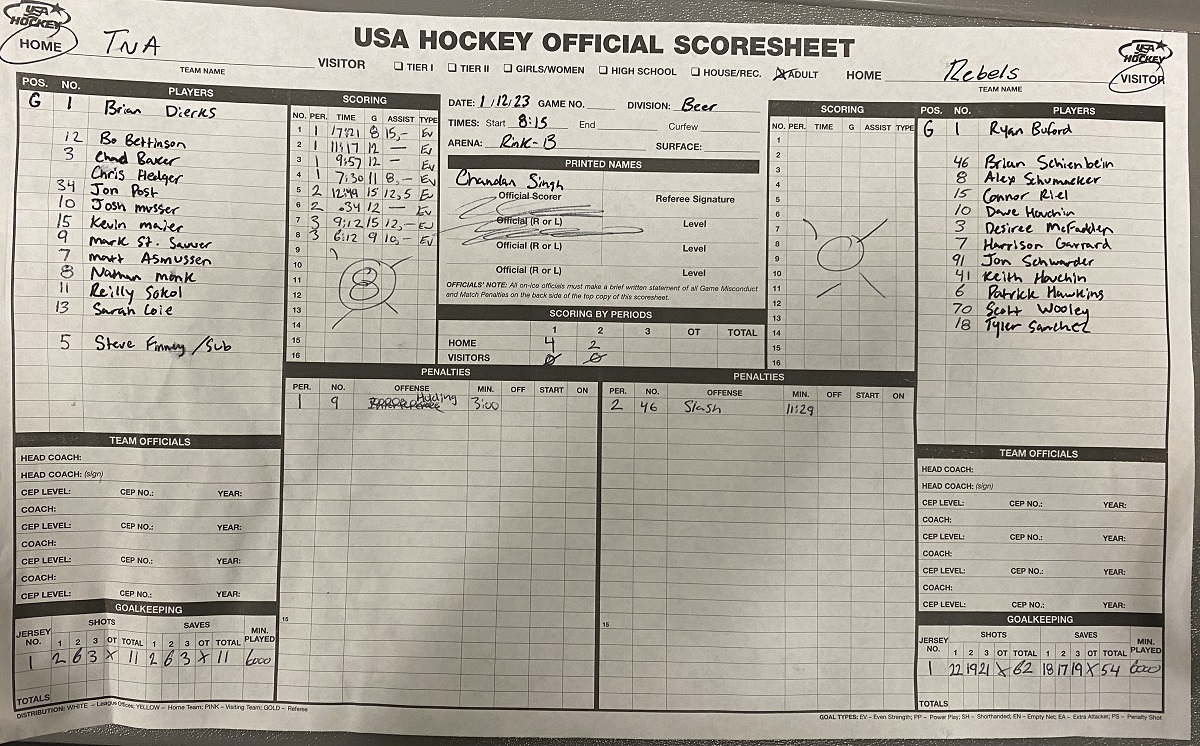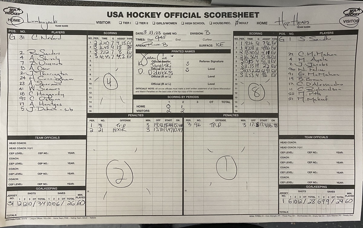 Champs: TNA13 1 1 0 27 15 107 52 Hockey Source HC 13 1 0 0 26 14 88 52 Hop Heads 11 4 0 0 22 15 87 63 Pawned Stars 8 5 1 0 17 14 79 81 Ice Bandits 8 6 0 0 16 14 80 60 Iron Horse 6 5 3 0 15 14 101 98 Nate's Nuts 6 7 1 0 13 14 71 91 Lumberjacks 5 7 2 0 12 14 57 83 Wave Design 3 10 1 0 7 14 55 70 Hotshots 3 11 0 0 6 14 56 80 Rebels 2 10 2 0 6 14 49 100 Date Home Team Away Team Location Scoring/Clock Results 2023-01-08 08:30 PM
