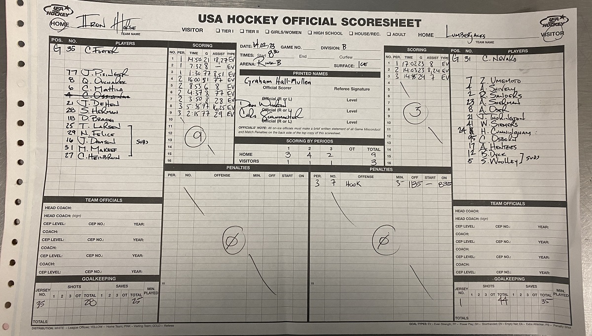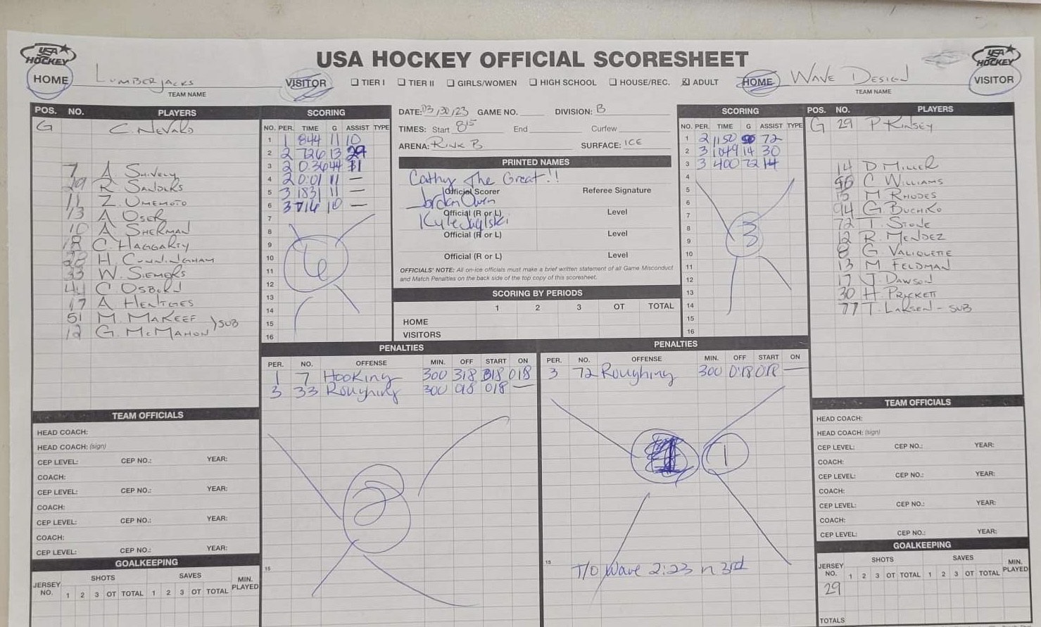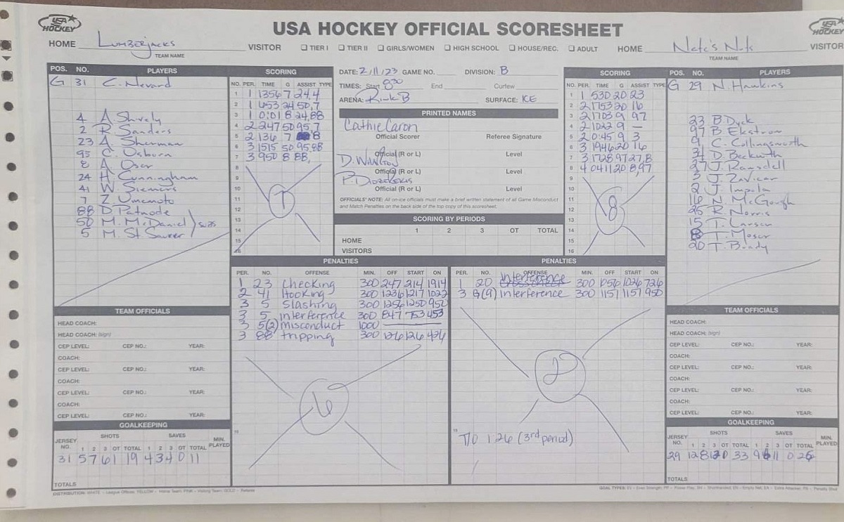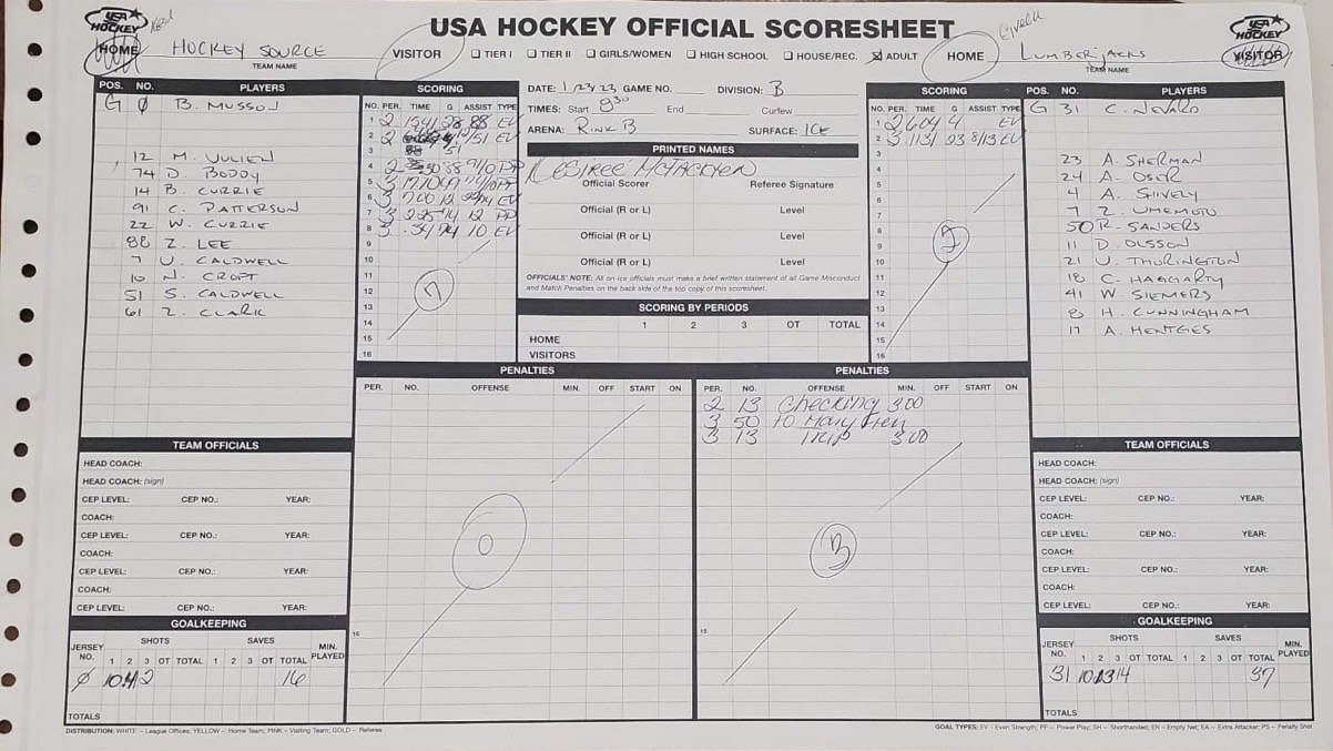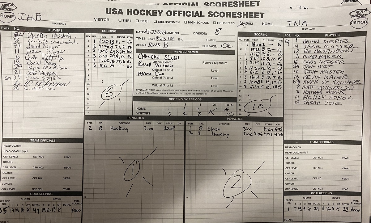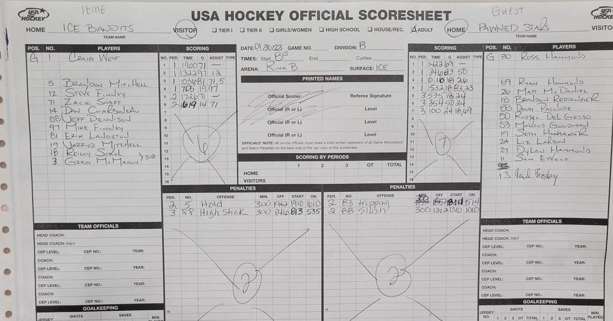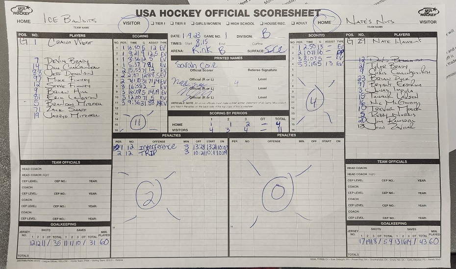 Champs: TNA13 1 1 0 27 15 107 52 Hockey Source HC 13 1 0 0 26 14 88 52 Hop Heads 11 4 0 0 22 15 87 63 Pawned Stars 8 5 1 0 17 14 79 81 Ice Bandits 8 6 0 0 16 14 80 60 Iron Horse 6 5 3 0 15 14 101 98 Nate's Nuts 6 7 1 0 13 14 71 91 Lumberjacks 5 7 2 0 12 14 57 83 Wave Design 3 10 1 0 7 14 55 70 Hotshots 3 11 0 0 6 14 56 80 Rebels 2 10 2 0 6 14 49 100 Date Home Team Away Team Location Scoring/Clock Results 2023-01-08 08:30 PM