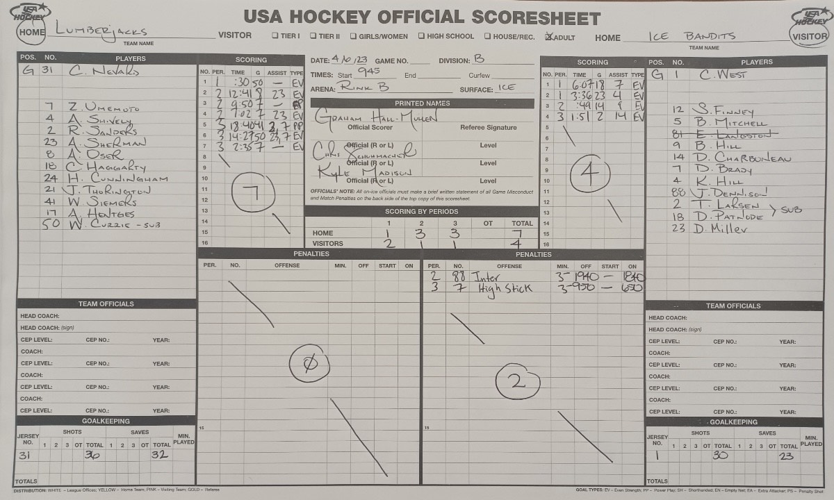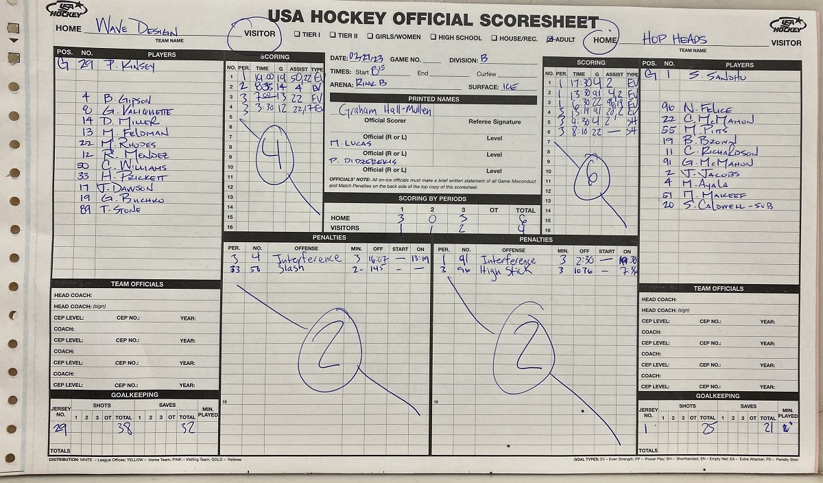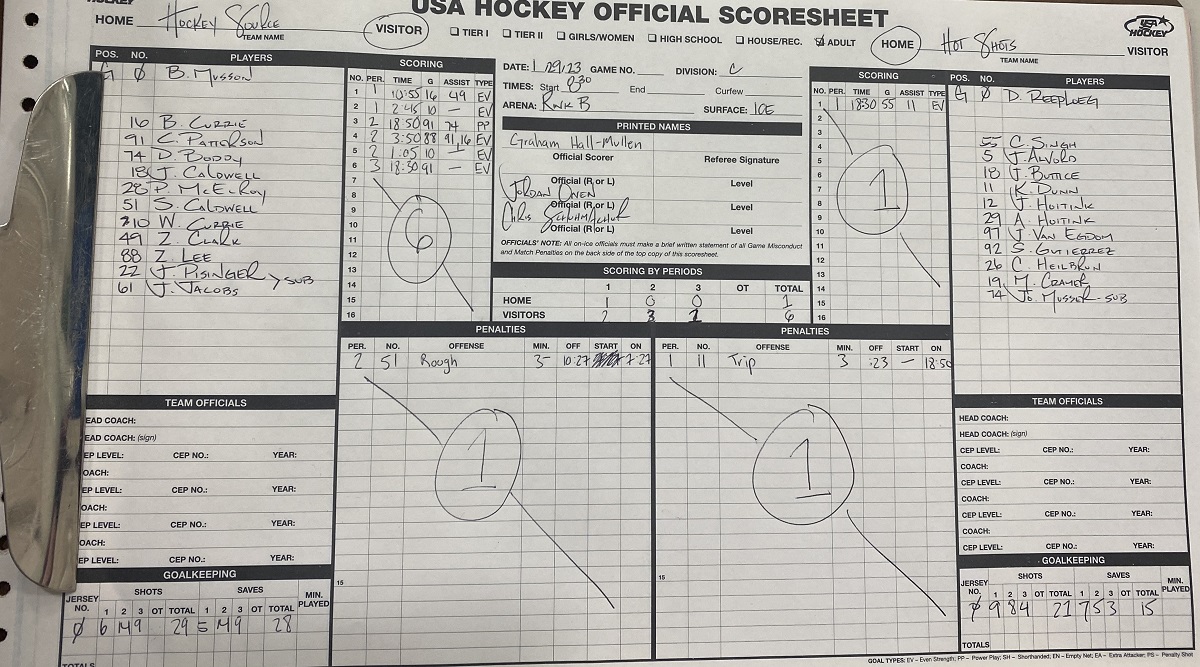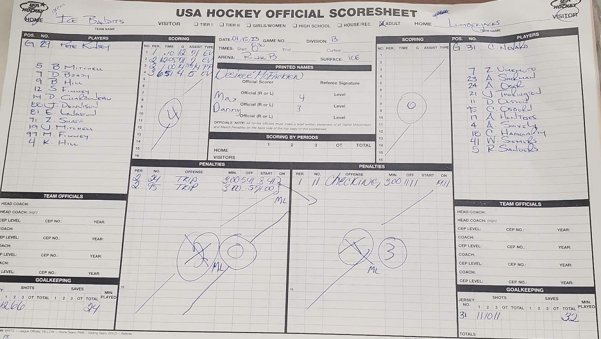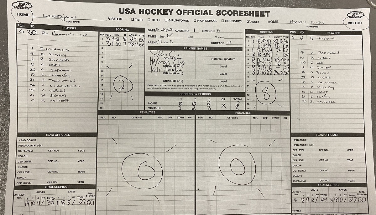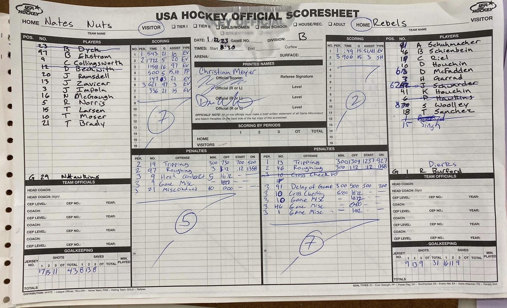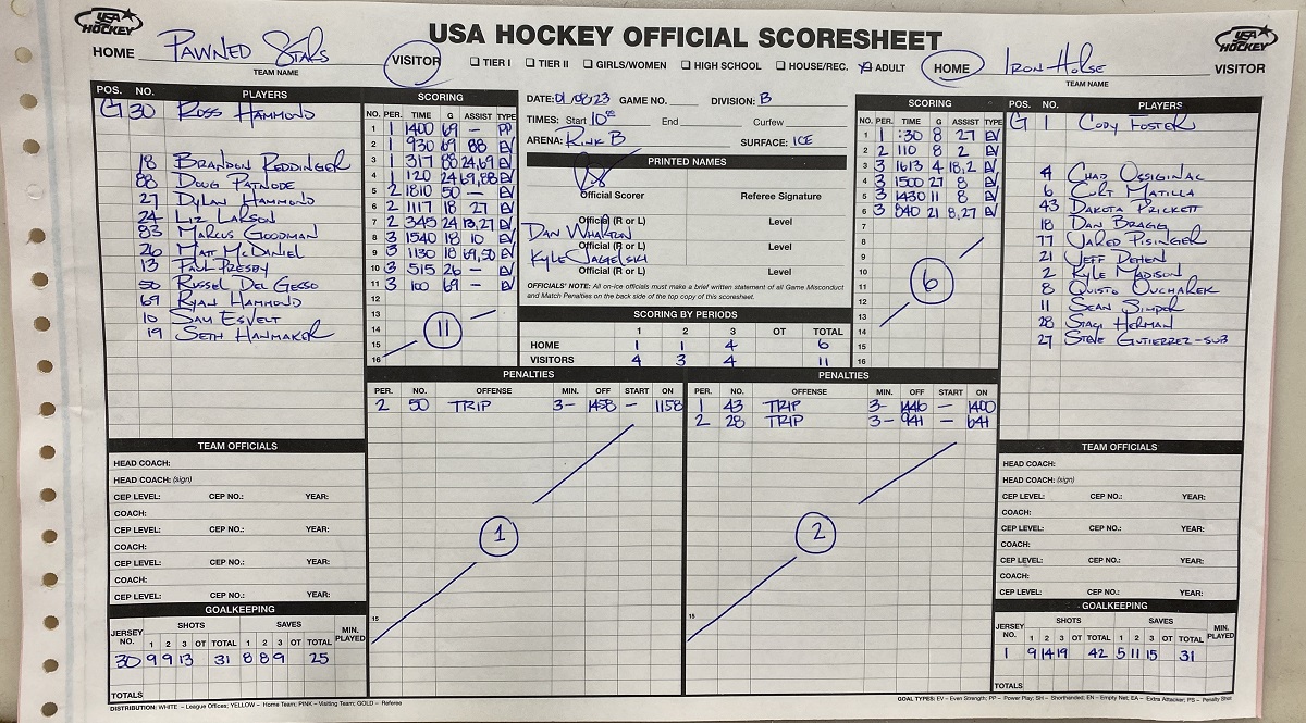 Champs: TNA13 1 1 0 27 15 107 52 Hockey Source HC 13 1 0 0 26 14 88 52 Hop Heads 11 4 0 0 22 15 87 63 Pawned Stars 8 5 1 0 17 14 79 81 Ice Bandits 8 6 0 0 16 14 80 60 Iron Horse 6 5 3 0 15 14 101 98 Nate's Nuts 6 7 1 0 13 14 71 91 Lumberjacks 5 7 2 0 12 14 57 83 Wave Design 3 10 1 0 7 14 55 70 Hotshots 3 11 0 0 6 14 56 80 Rebels 2 10 2 0 6 14 49 100 Date Home Team Away Team Location Scoring/Clock Results 2023-01-08 08:30 PM