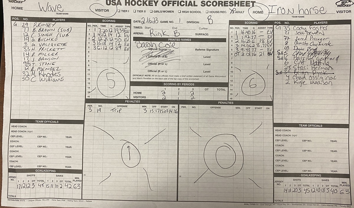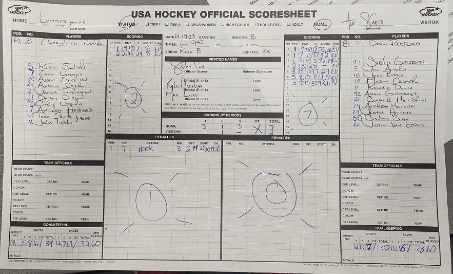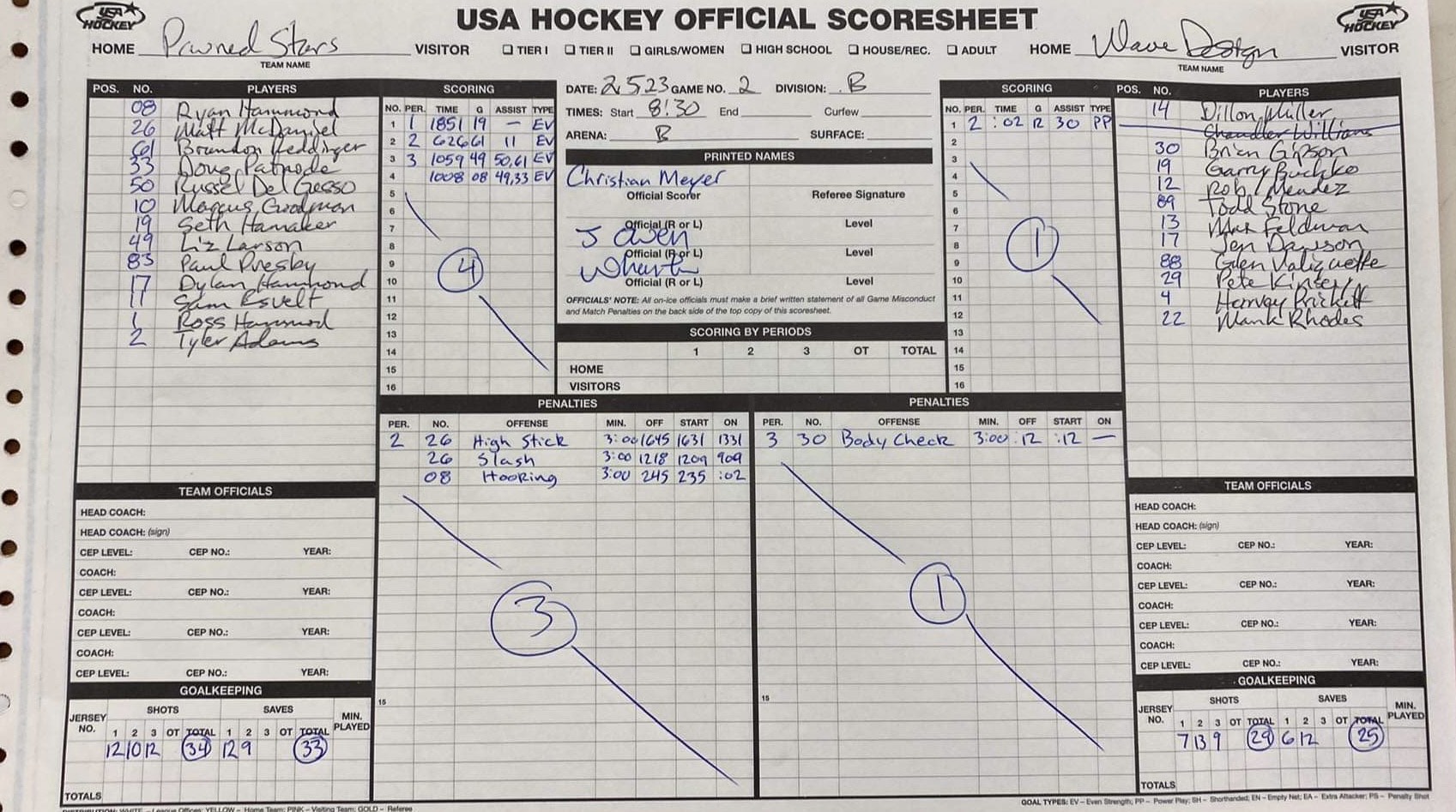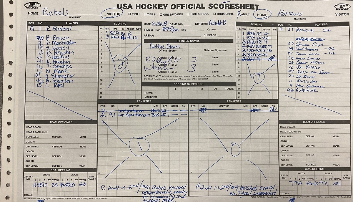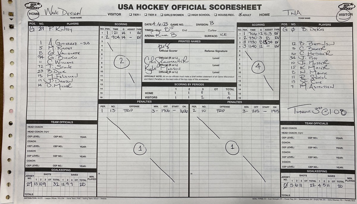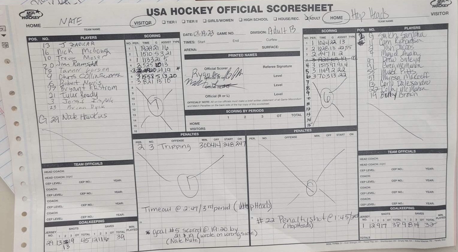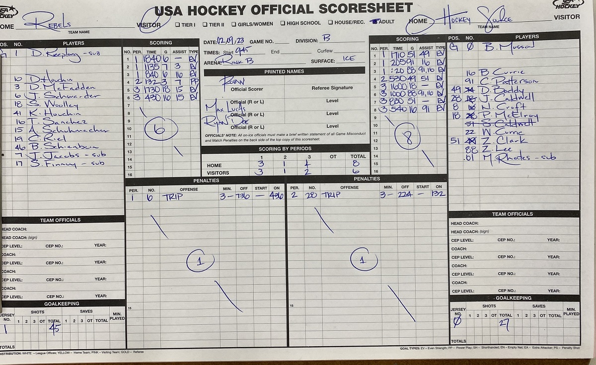 Champs: TNA13 1 1 0 27 15 107 52 Hockey Source HC 13 1 0 0 26 14 88 52 Hop Heads 11 4 0 0 22 15 87 63 Pawned Stars 8 5 1 0 17 14 79 81 Ice Bandits 8 6 0 0 16 14 80 60 Iron Horse 6 5 3 0 15 14 101 98 Nate's Nuts 6 7 1 0 13 14 71 91 Lumberjacks 5 7 2 0 12 14 57 83 Wave Design 3 10 1 0 7 14 55 70 Hotshots 3 11 0 0 6 14 56 80 Rebels 2 10 2 0 6 14 49 100 Date Home Team Away Team Location Scoring/Clock Results 2023-01-08 08:30 PM