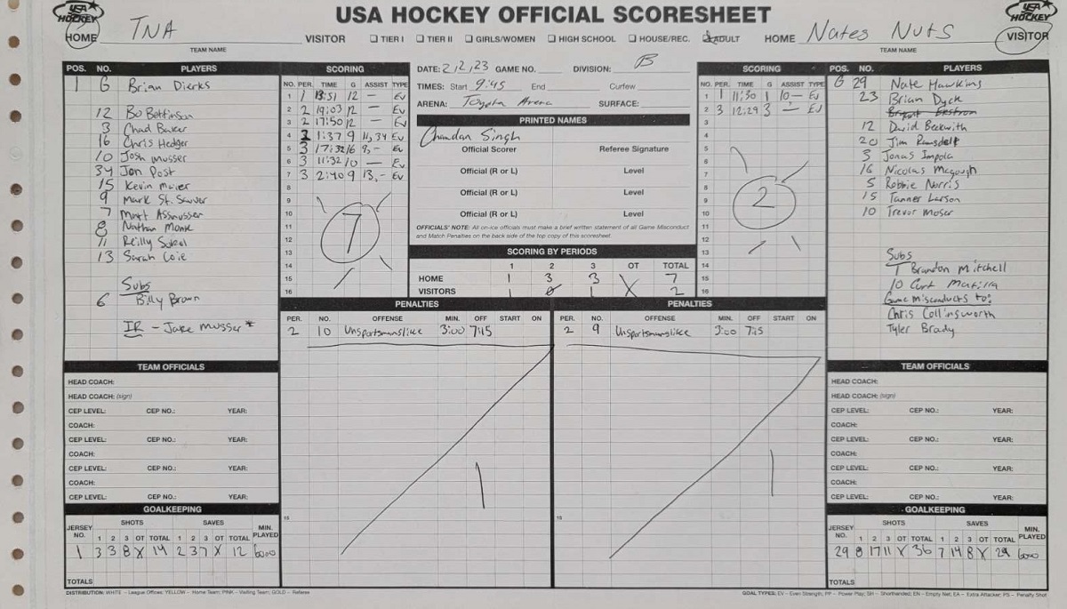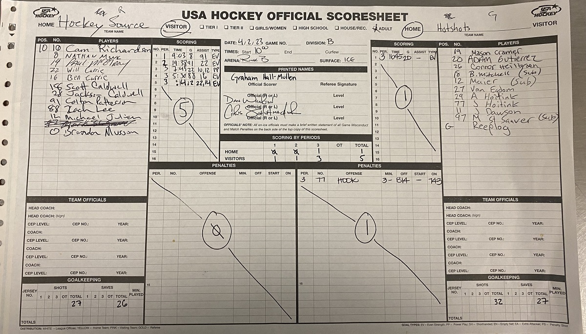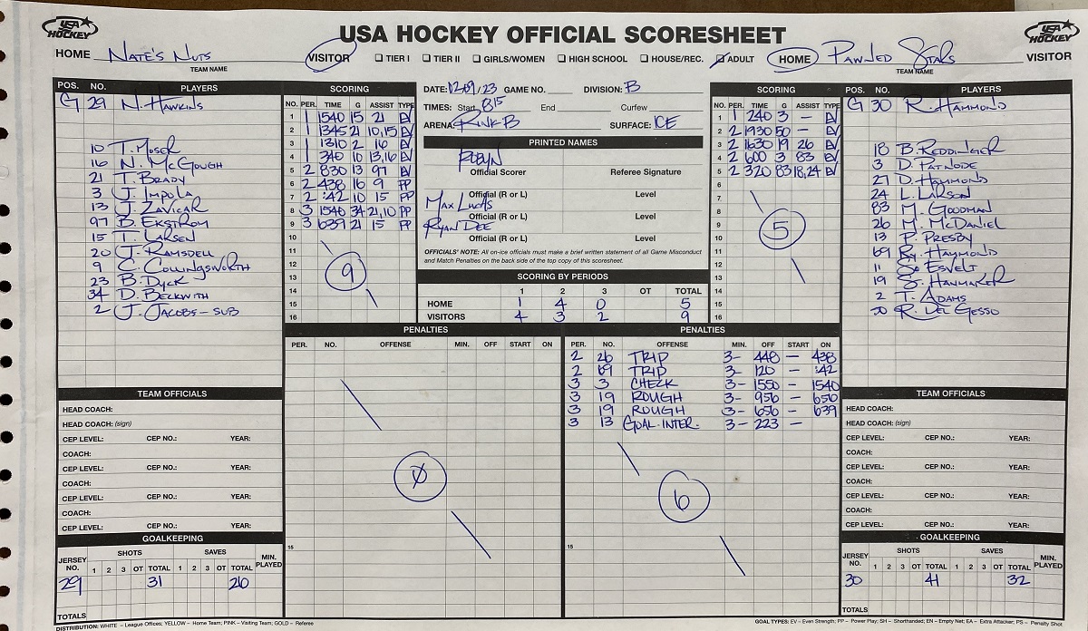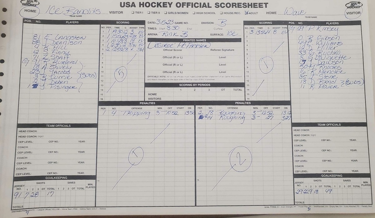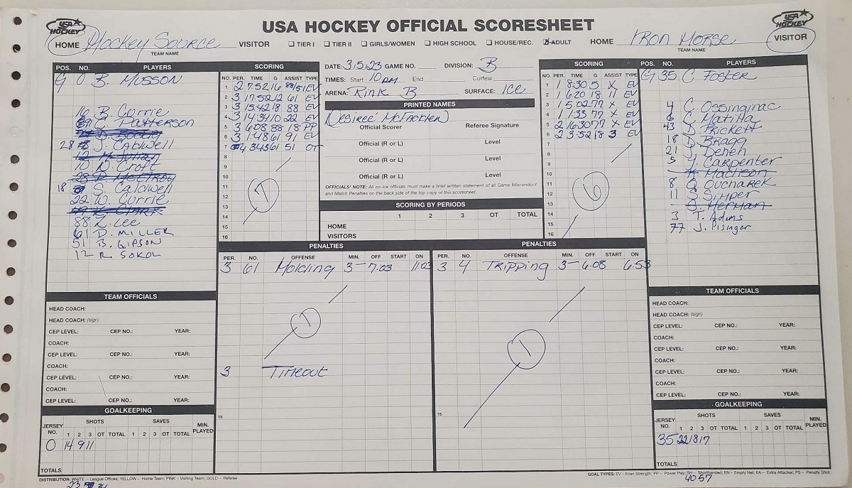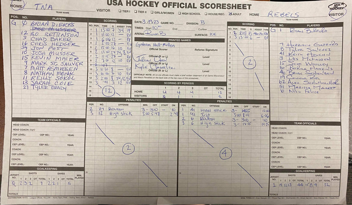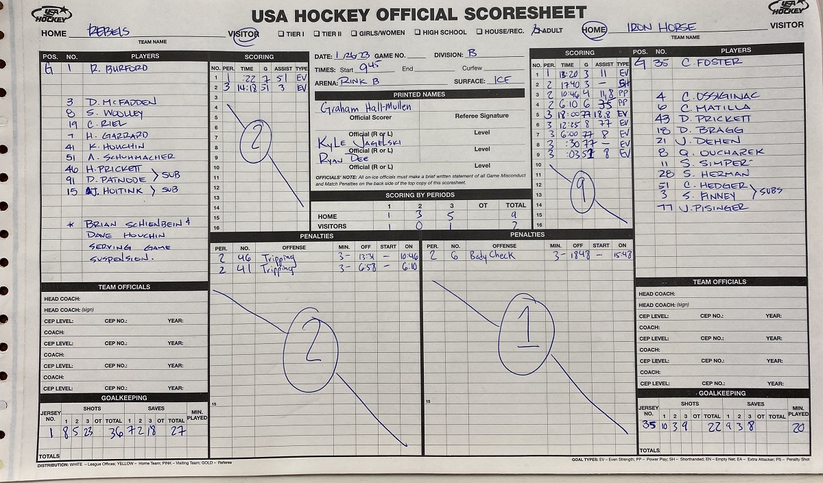 Champs: TNA13 1 1 0 27 15 107 52 Hockey Source HC 13 1 0 0 26 14 88 52 Hop Heads 11 4 0 0 22 15 87 63 Pawned Stars 8 5 1 0 17 14 79 81 Ice Bandits 8 6 0 0 16 14 80 60 Iron Horse 6 5 3 0 15 14 101 98 Nate's Nuts 6 7 1 0 13 14 71 91 Lumberjacks 5 7 2 0 12 14 57 83 Wave Design 3 10 1 0 7 14 55 70 Hotshots 3 11 0 0 6 14 56 80 Rebels 2 10 2 0 6 14 49 100 Date Home Team Away Team Location Scoring/Clock Results 2023-01-08 08:30 PM