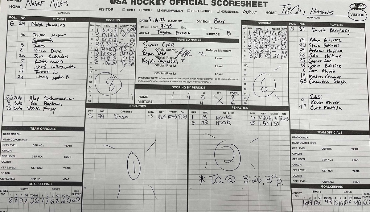 2023-03-16 09:45 PM Nate's Nuts Hotshots Toyota Arena Sarah Coie 8 - 6