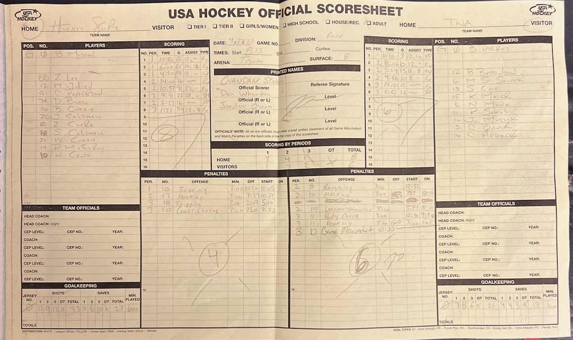 Champs: Hockey Source HC2 0 0 0 4 2 17 11 TNA 1 1 0 0 2 2 12 12 Hop Heads 0 1 0 0 0 1 4 6 Pawned Stars 0 1 0 0 0 1 5 9 Date Home Team Away Team Location Scoring/Clock Results Consolation 2023-04-16 08:30 PM