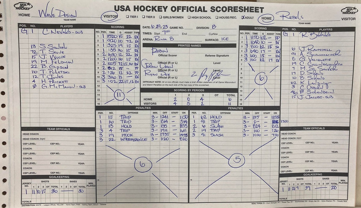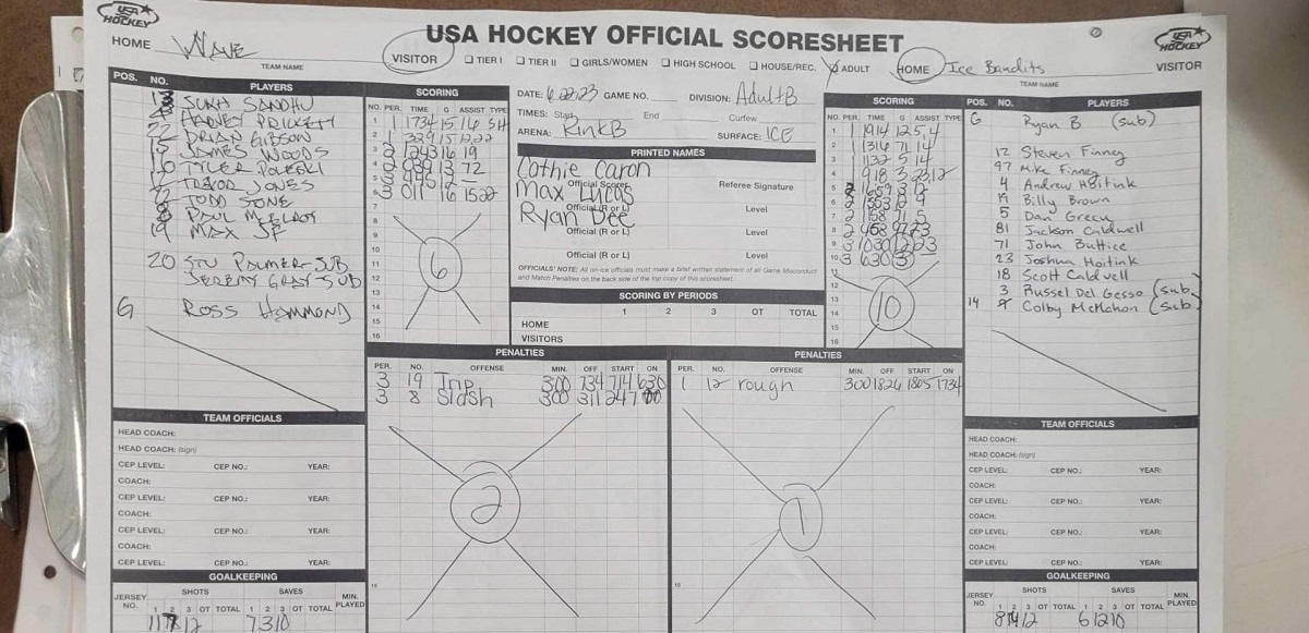 Champs: TimeLords8 3 0 0 16 11 63 67 Ice Bandits 8 3 0 0 16 11 61 39 Lumberjacks 7 2 2 0 16 11 83 56 Wave Design 6 5 0 0 12 11 73 73 TNA 5 4 2 0 12 11 67 60 Nate's Nuts 5 5 1 0 11 11 66 62 Hop Heads 5 6 0 0 10 11 76 74 Pawned Stars 5 6 0 0 10 11 72 82 Iron Horse Brewery 3 6 2 0 8 11 73 93 Rebels 3 8 0 0 6 11 53 81 Date Home Team Away Team Location Scoring/Clock Results 2023-05-07 08:30 PM