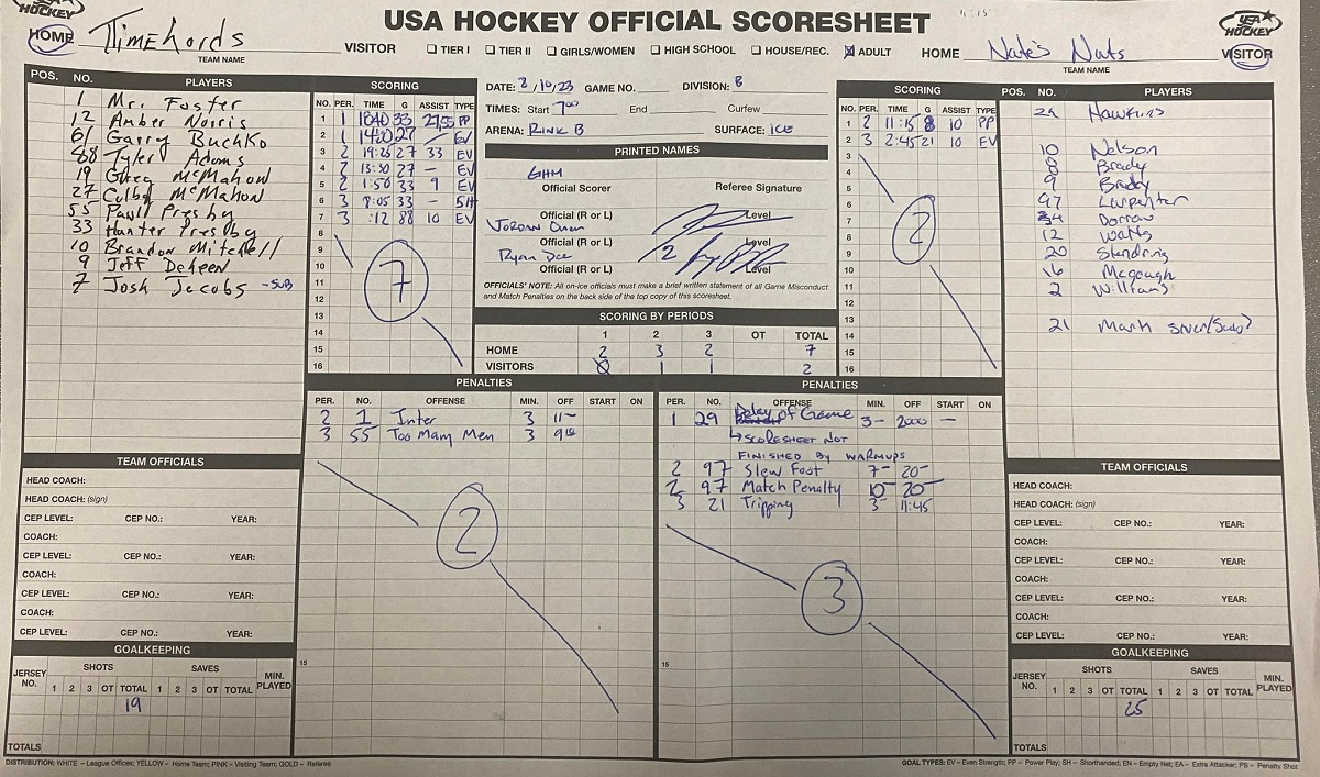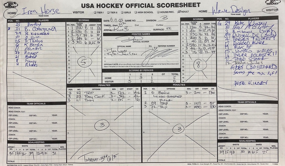 Champs: Ice Bandits3 0 0 0 6 3 14 6 TimeLords 2 0 1 0 5 3 17 9 TNA 1 1 0 0 2 2 16 15 Nate's Nuts 1 1 0 0 2 2 16 19 Wave Design 0 2 0 0 0 2 4 13 Hop Heads 0 1 0 0 0 1 9 9 Lumberjacks 0 1 0 0 0 1 14 11 Pawned Stars 0 1 0 0 0 1 10 28 Date Home Team Away Team Location Scoring/Clock Results Consolation 2023-07-30 08:30 PM