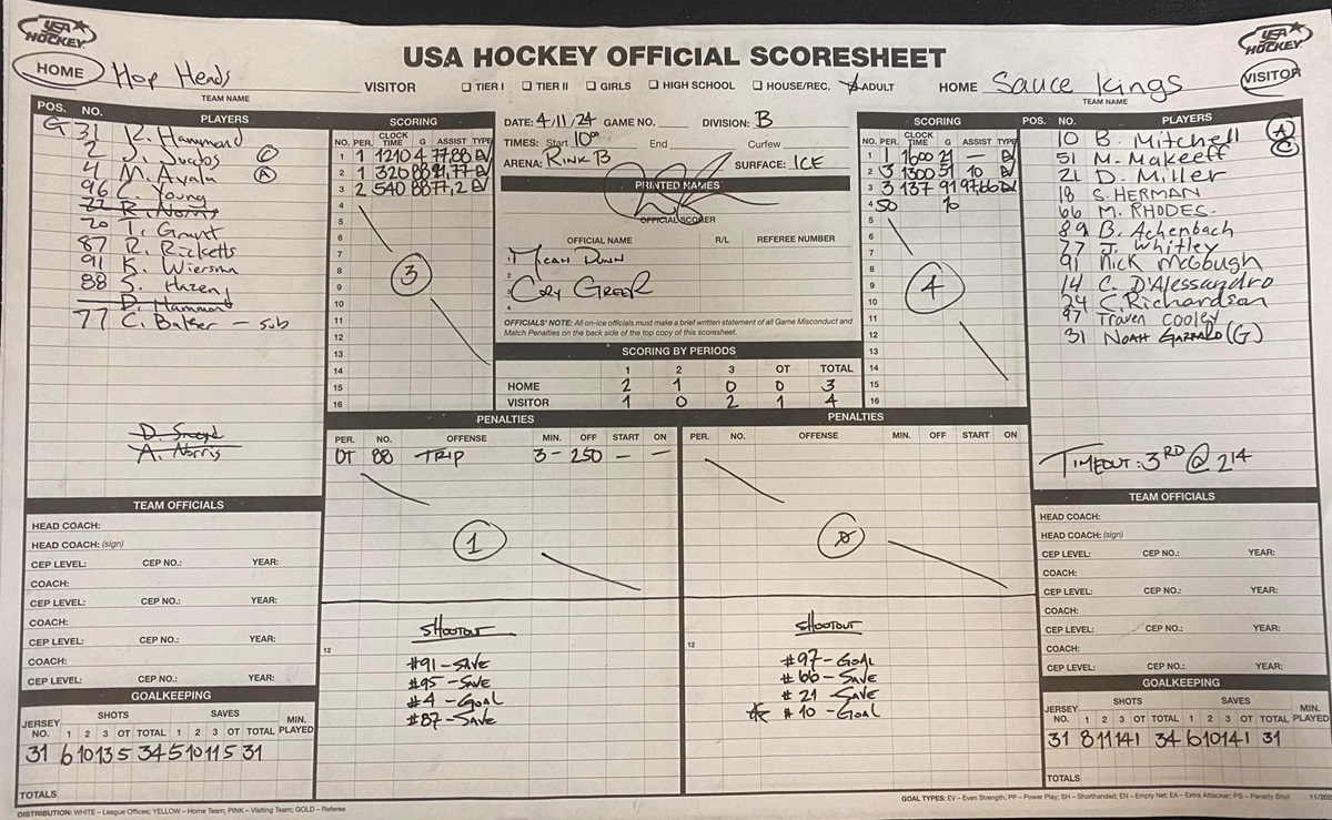 2024-04-11 10:00 PM Hop Heads Sauce Kings Toyota Arena Robyn Sanders 3 - 4 SO