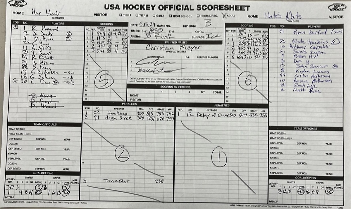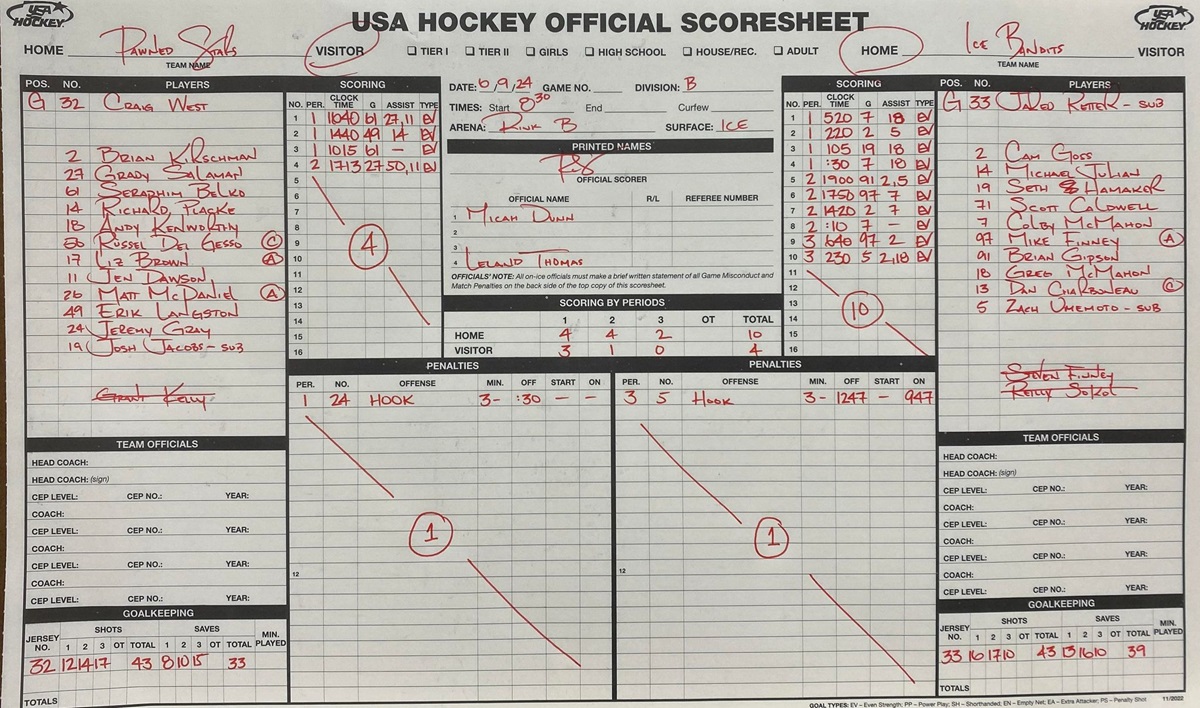 Champs: Ice Bandits8 2 0 0 16 10 57 40 TNA 7 3 0 0 14 10 61 46 TimeLords 6 3 1 0 13 10 34 32 Nate's Nuts 5 5 0 0 10 10 66 53 Iron Horse Brewery 4 6 0 0 8 10 48 59 Pawned Stars 4 6 0 0 8 10 52 73 Sauce Kings 3 5 2 0 8 10 34 44 Hop Heads 3 5 2 0 8 10 42 49 Date Home Team Away Team Location Scoring/Clock Results 2024-04-07 08:30 PM